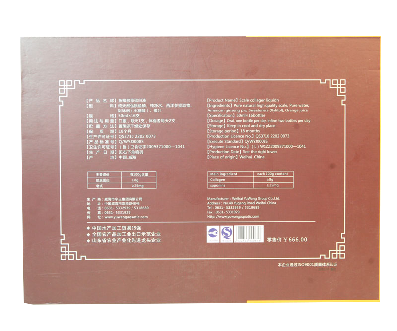 配料:純粋で天然の優良品質のうろこ、精製水、西洋參エキス、甘味剤(キシリトール)、オレンジジュース