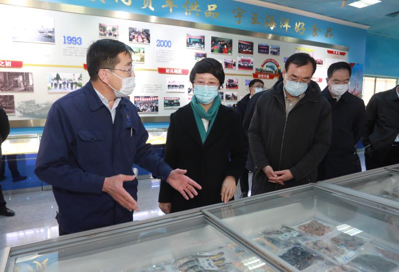 孔凡萍市長一行走進宇王集團水產品加工示范企業宇祥工廠,通過觀看監控了解工廠生產加工全過程,聽取宇王集團加強食品安全和冷鏈管控工作匯報,得知水產品出口日本市場并受到日本消費者認可時,孔市長給予表揚。隨后孔市長參觀宇王集團海洋生物館產品展示大廳,隋樹武邊走邊介紹宇王集團近幾年軍民融合工作開展情況及下步工作計劃安排。