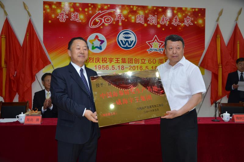 中國水產(chǎn)流通與加工協(xié)會秘書長邸剛代表行業(yè)協(xié)會為宇王集團創(chuàng)立60周年表示祝賀,并向宇王集團頒發(fā)了“中國海參研發(fā)生產(chǎn)基地”和“威海市宇王集團愛之信商學(xué)院指定培訓(xùn)機構(gòu)”的牌匾,向宇王集團合作客戶日本株式會社辻野、日本株式會社丸福食品授予“中日友好合作最佳誠信商社”證書。