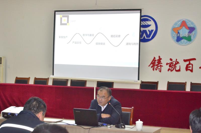 柳律師并沒有高屋建瓴詳談法律法條,而是結合企業發展實際情況從參會人員的日常工作和生活出發,深入淺出的為大家解答疑惑。在“安全生產、產品責任、合同簽字蓋章、細說借條、不動產歸屬權、酒駕與刑罰”等六個分類事項上,通過身邊大量案例講解,概念闡述,現場互動等方式授課。整場內容豐富,寓意深刻,易于接受,令所有參訓人員感到意猶未盡,受益匪淺。
