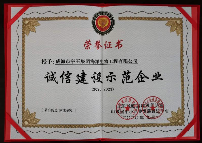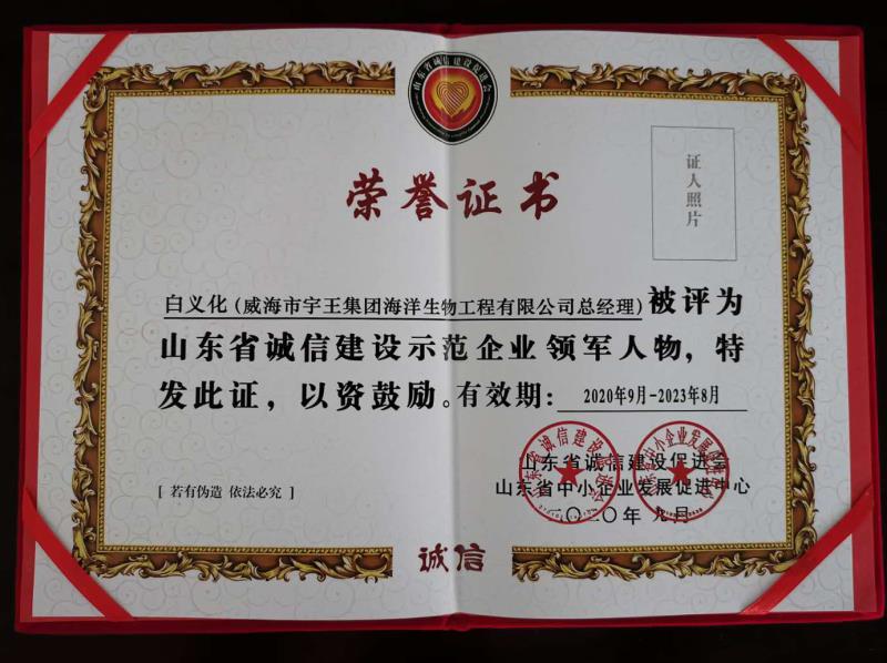 9月28日,學習貫徹山東省社會信用條例暨全省企業誠信建設示范工作會議在濟南召開。會上,宇王集團海洋生物工程有限公司榮獲山東省“誠信建設示范企業",白義化經理榮獲“山東省誠信建設示范企業領軍人物”。